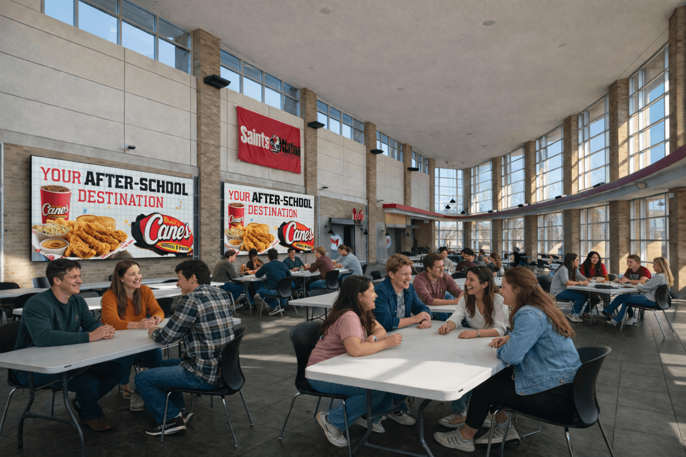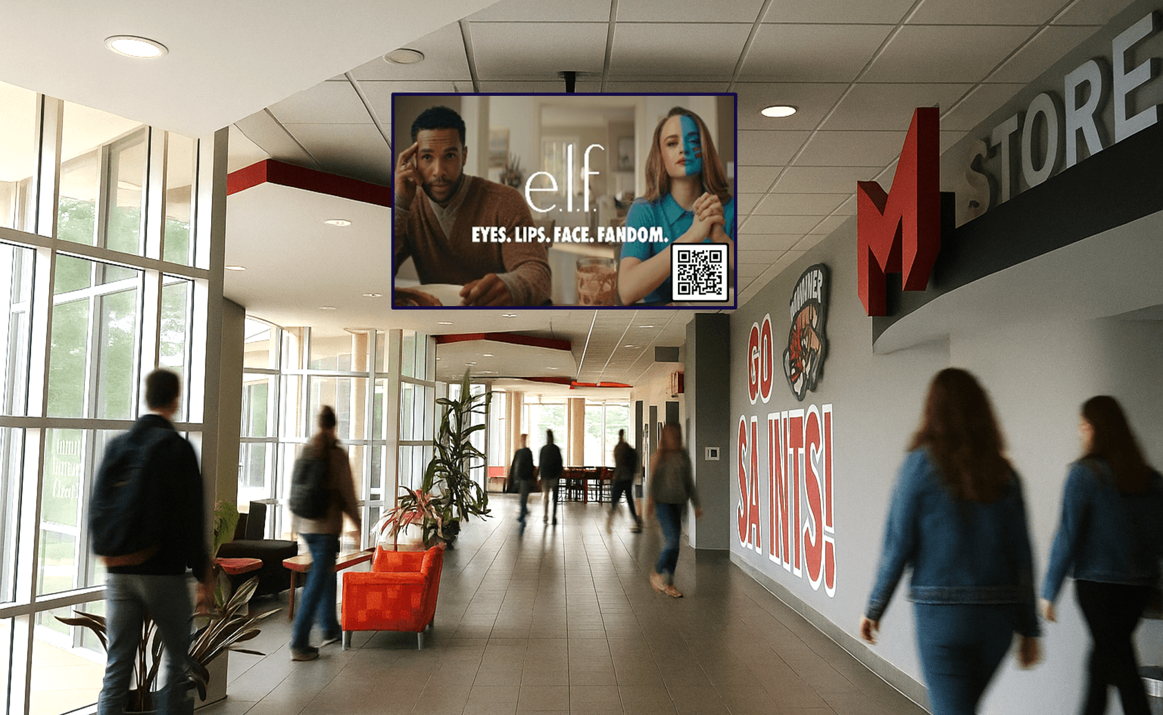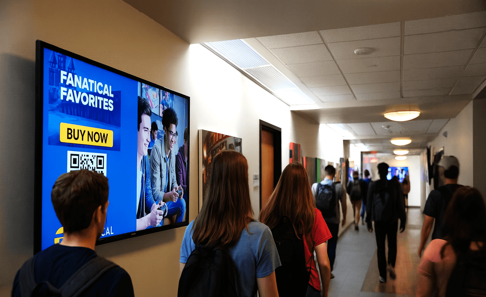 No swipe. No skip button. No ad blocker. No algorithmic feed to disappear into. Your brand appears on full-motion screens in moments students are physically present for.
