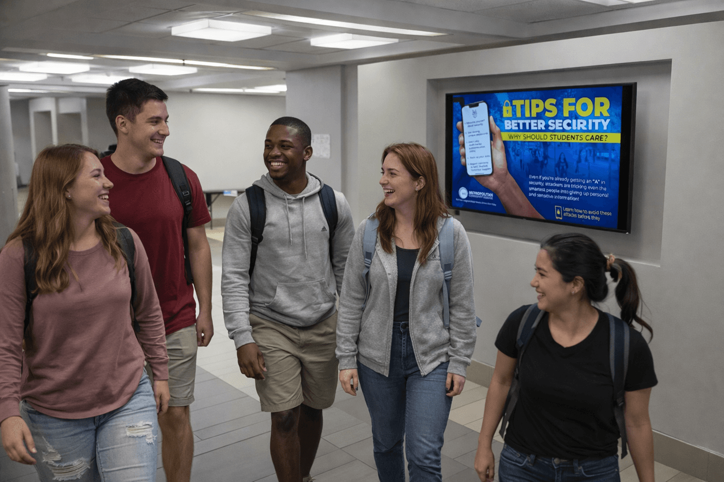 Reach Gen Z and Millennial audiences in high-trust campus environments 220+ days a year, 3–5 hours per visit, on video-first screens they can't skip.