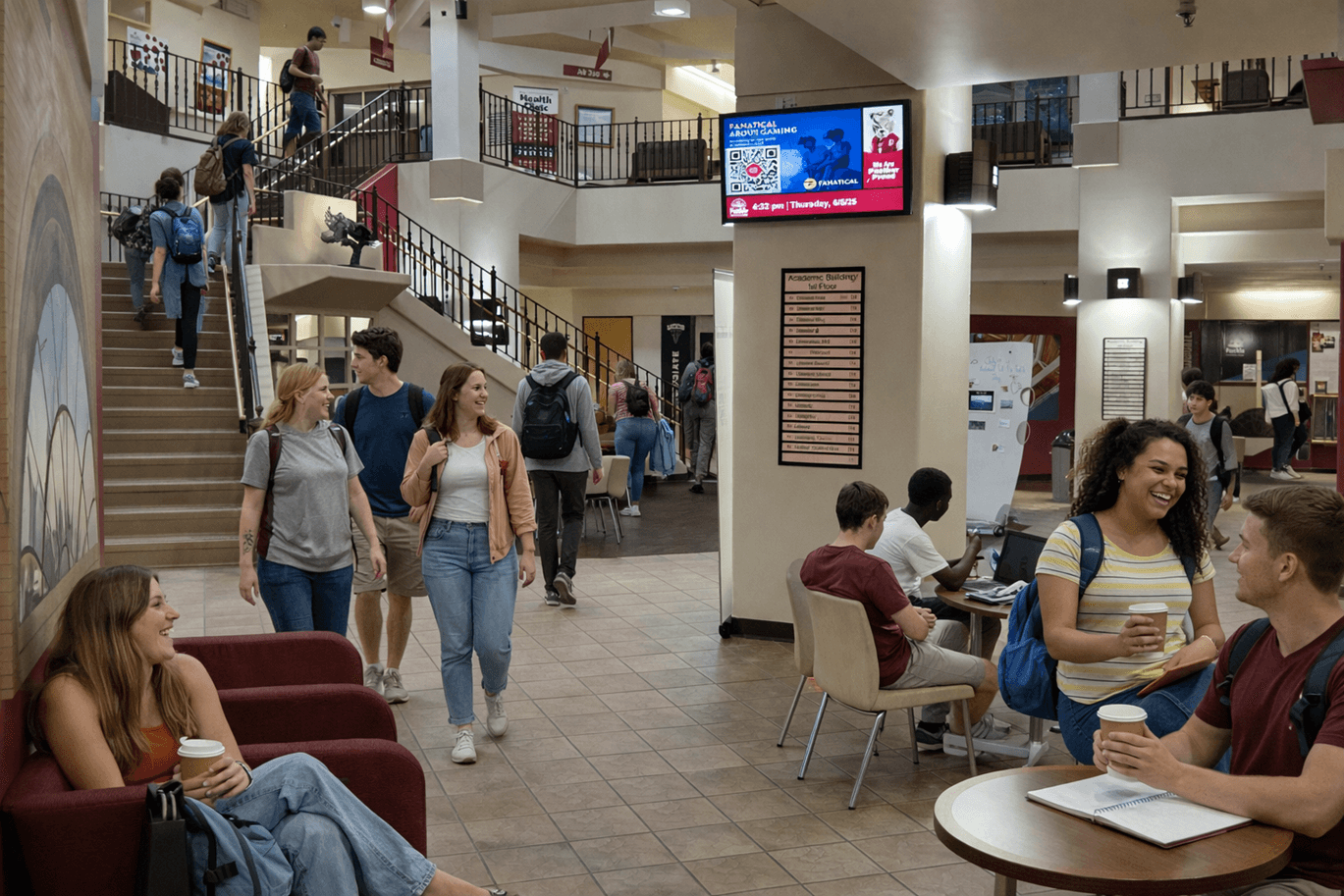 VenuEdge screens are positioned where campus life happens - the spaces students move through, gather in, eat, study, and return to every single day.